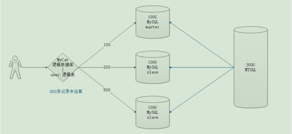 • 我们来说个例子,大海捞针和一个水瓶里捞针,毋庸置疑水瓶里一定能更快找到针,因为它需要检索的范围更小。数据库集群也是如此原理,我们可以将一个数据量为300G的数据库数据平均拆分成3部分,每个数据库中只存储100G数据,此时用户搜索,先经过我们中间代理层,中间代理层同时发出3个请求执行查询,比如第1台返回100条数据,耗时3秒,第2台返回200条数据,耗时3秒,第3台返回500条数据,耗时3秒,此时中间件只需要在800条记录中进行筛选,即可检索出用户要的结果,此时耗时其实一共只有3秒,因为每台机器做运算的时候,都是同时执行。如果我们此时直接在300G的数据库查询,耗时10秒,那使用中间件进行集群的效率就非常明显