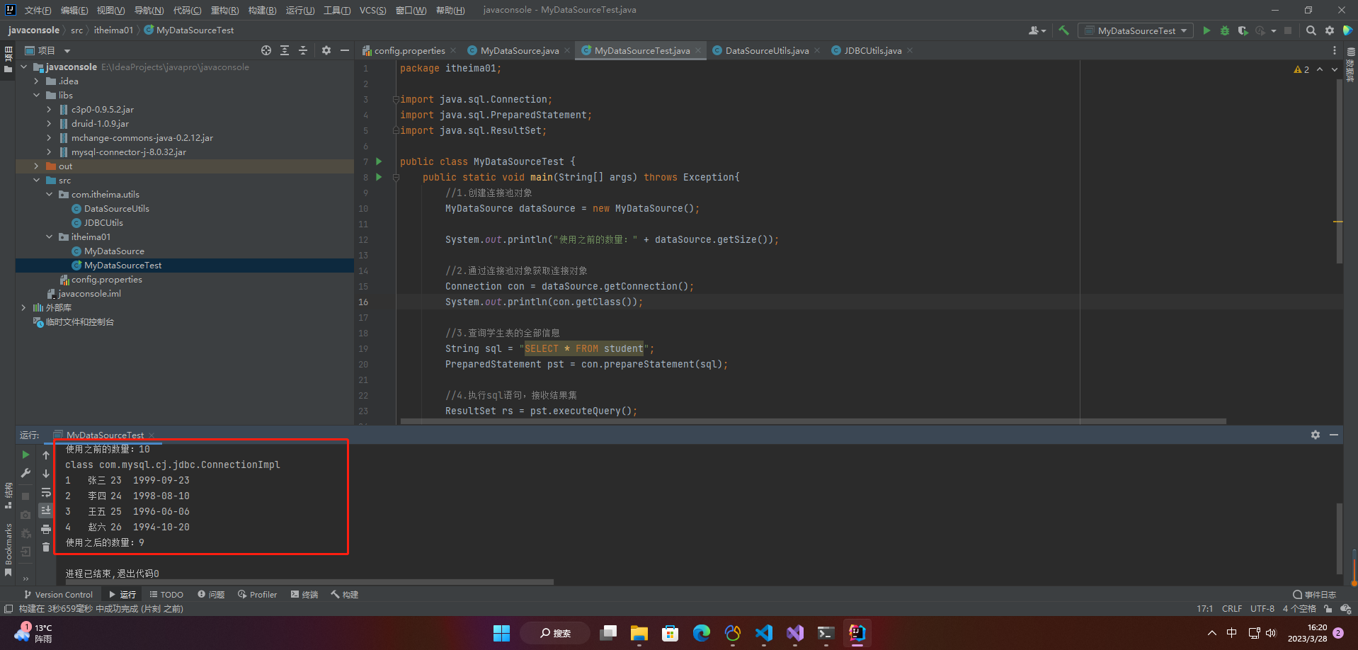 4.通过Druid连接池工厂类获取数据库连接池对象