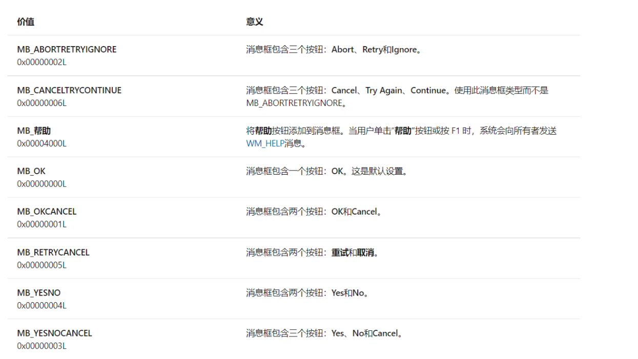要指示消息框中显示的按钮,请指定以下值之一。