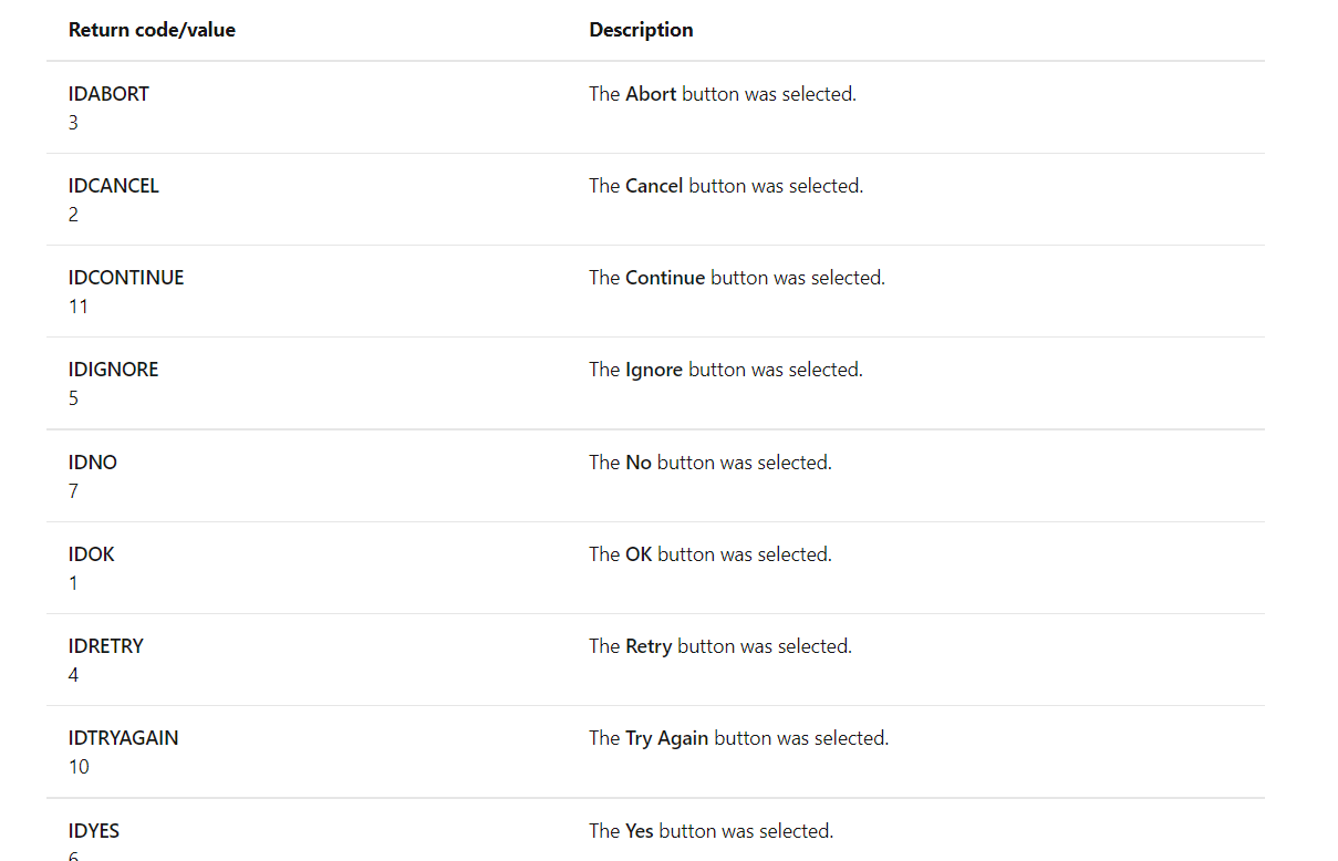 消息框返回一个整数值,指示用户单击了哪个按钮。
