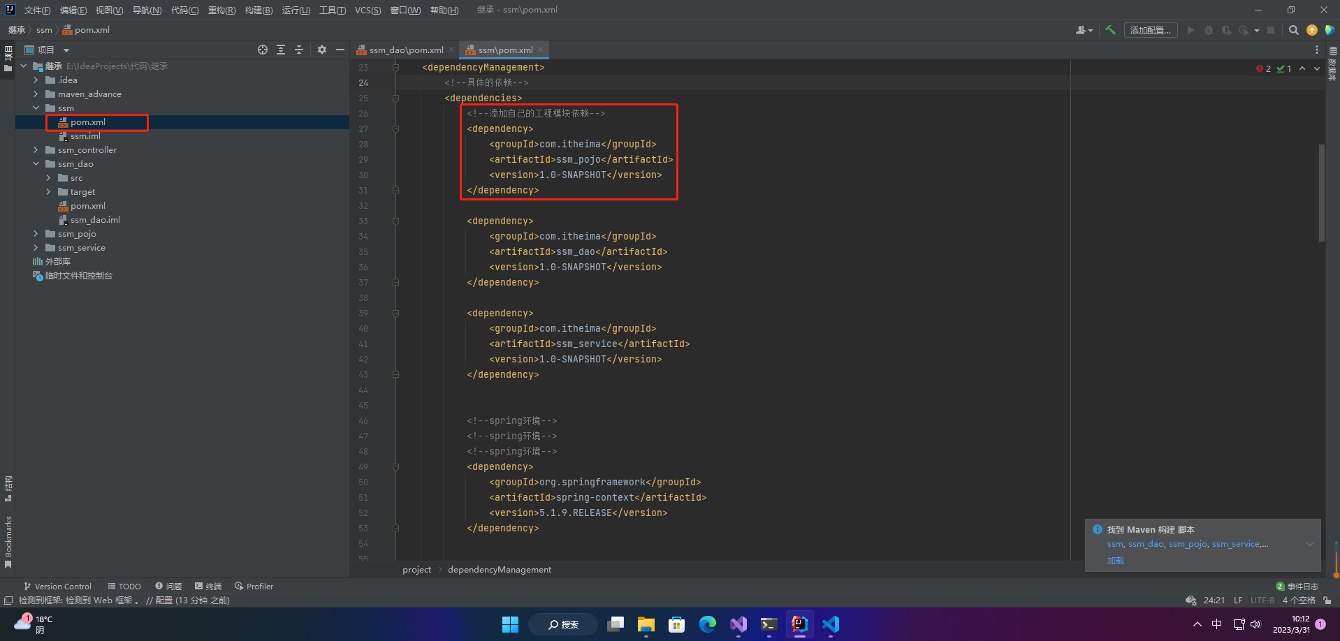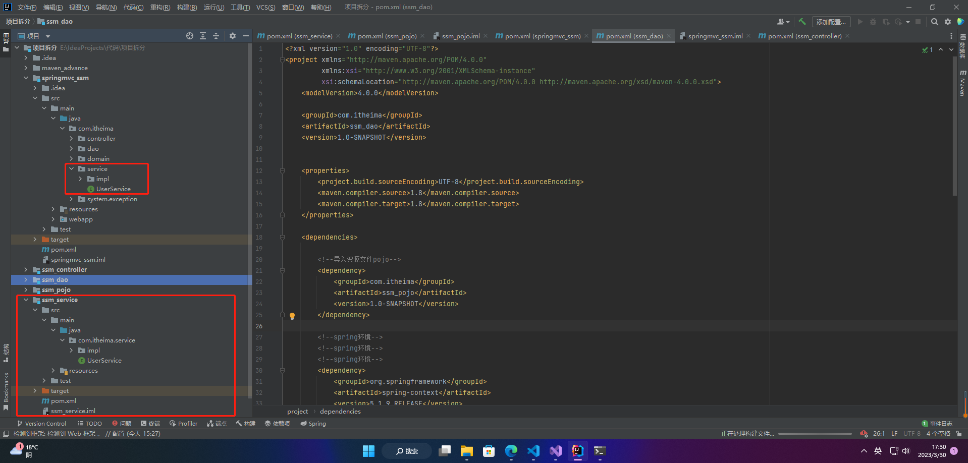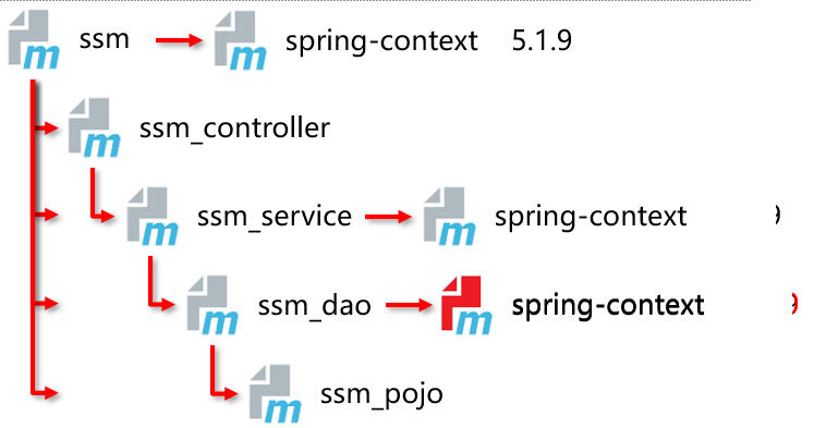 • 间接依赖ssm_pojo(由ssm_dao模块负责依赖关系的建立)