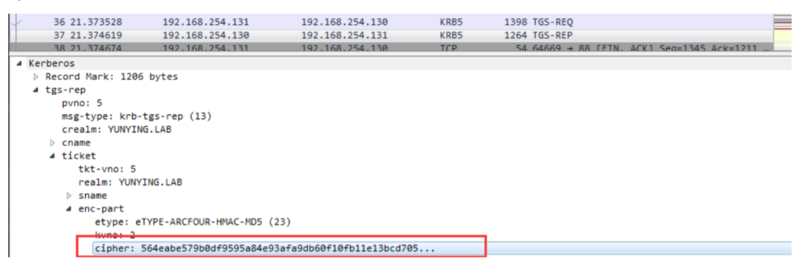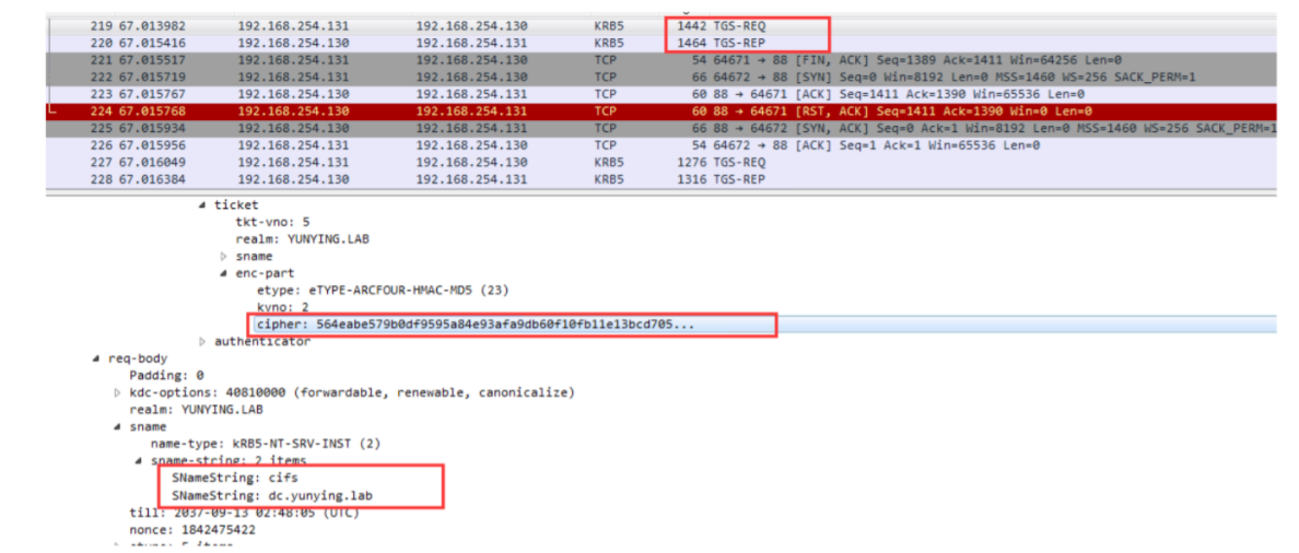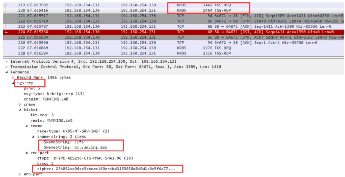 请求之后返回了一张针对 dc.yunying.lab(域控)的 CIFS 票据也就是正常流程中的 ST(Service Ticket)票据(234062 开头):