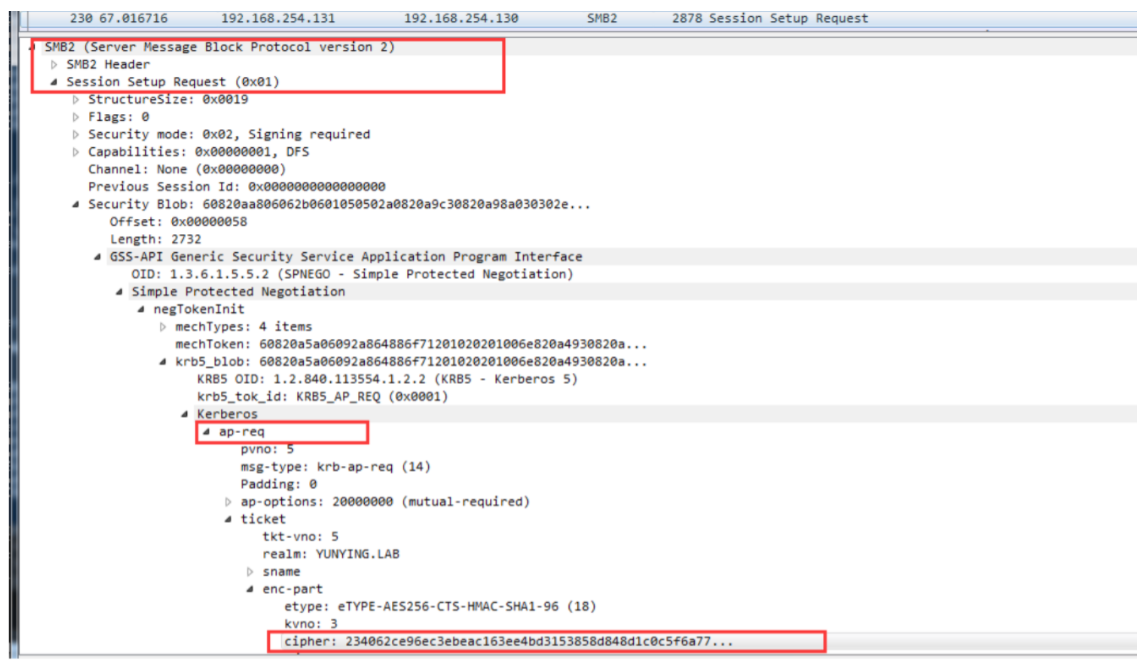 这时在抓的包中发现并没有 AP_REQ 这个流程,是因为在 Kerberos 中 AP_REQ 这个过程放在 了服务的第一次请求中,这里是放在 SMB 的 Session Setup Request 中(其他协议同理,比如 HTTP 协议是放在 GET 请求中)。