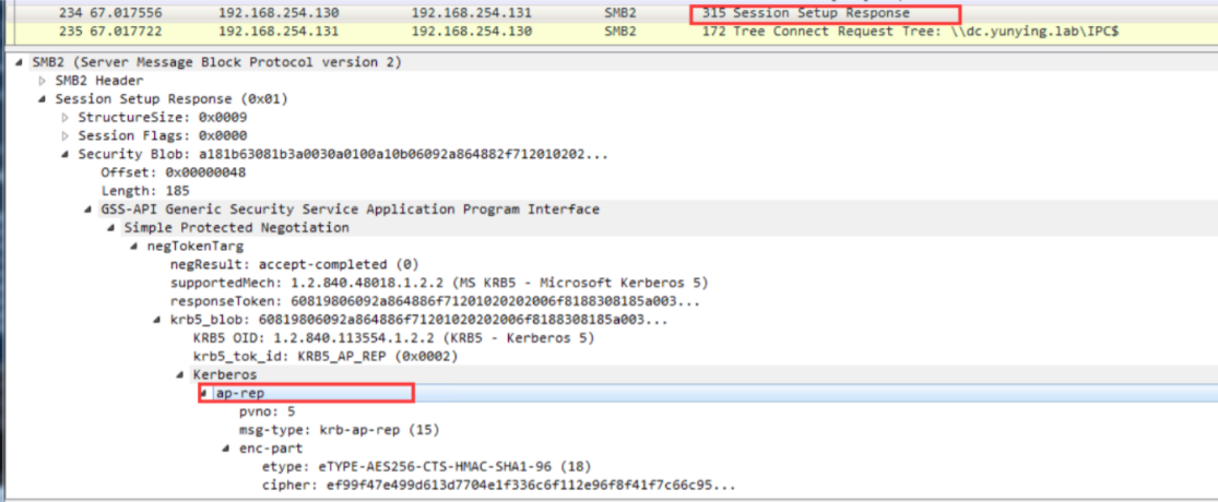 然后在 SMB 的 Session Setup Response 中做出响应,也就是 AP-REP 这个流程。