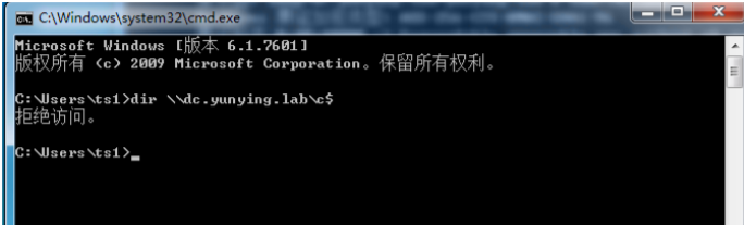 一、首先在域内主机s1上通过dir来访问域控的共享文件夹,示拒绝访问。