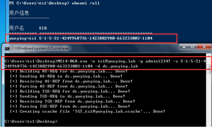 -s为ts1的SID值,可以通过whoami/all来获取用户的SID值