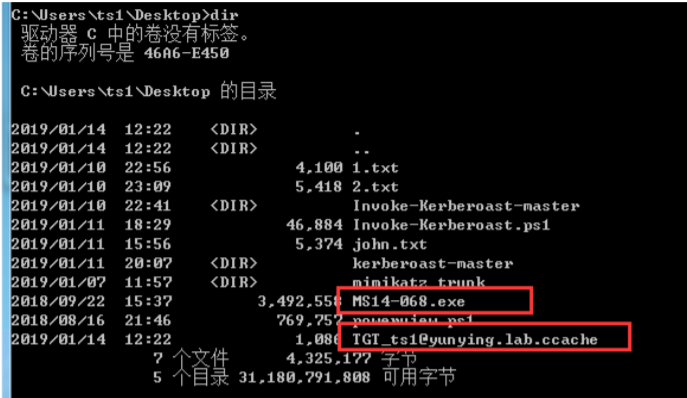 当 Pykek 工具接收到新的 TGT 之后就将其保存生成 ccache 文件。也就是说这时 Client 已 经获得了一张包含有高权限 PAC 内容的正常的 TGT 票据(564eab 开头)。