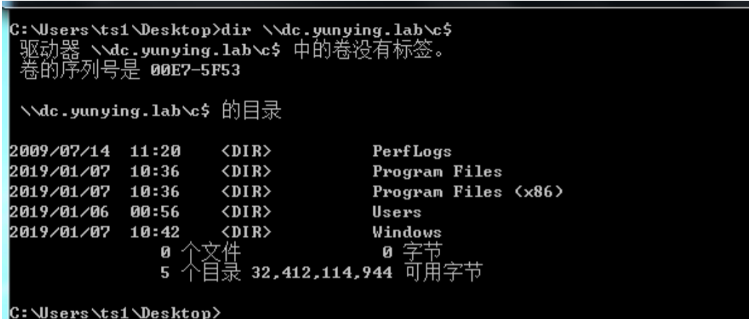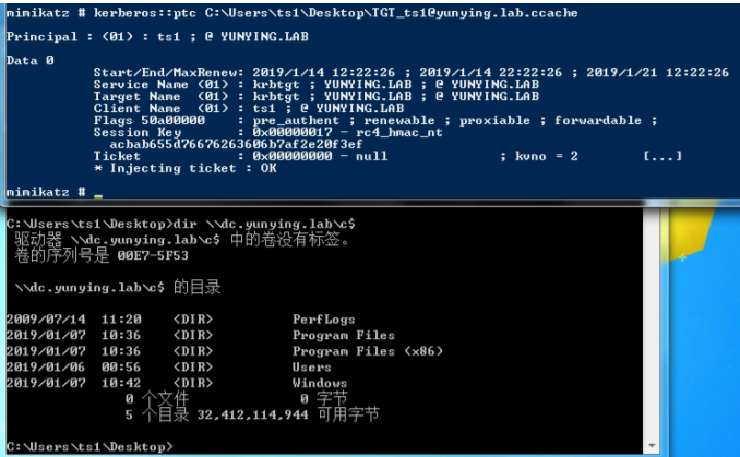 使用 Mimikatz 利用 TGT 访问 DC 共享文件夹 这时我们通过 mimikatz 来导入票证,并且用 dir//dc.yunying.lab/c$来访问域控的共享文件夹。