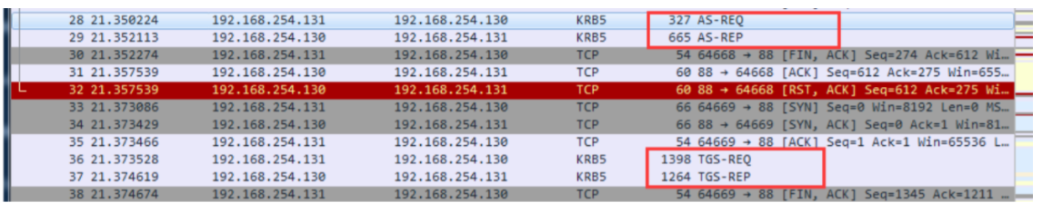 MS14068工具在使用过程中抓包可以看到s1和域控192.168.254.130(实质上是与安装在域控上的KDC)有KRB_AS_REQ、KRB_AS_REP、KRB_TGS_REQ、KRB_TGS_REP四次交互。