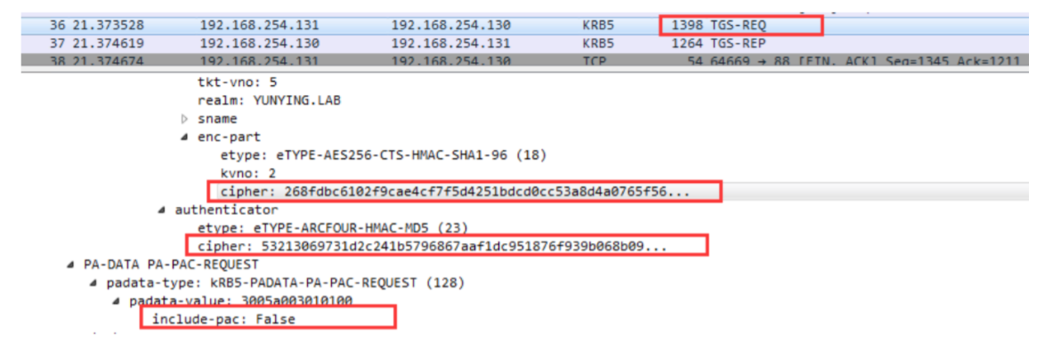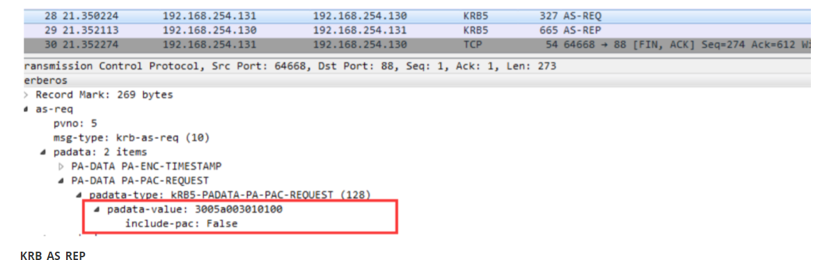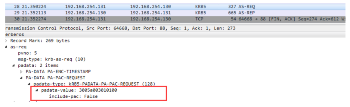 通过 PCAP 包可以更直观的看到在 AS-REQ 请求中的 include-pac:False 字段。这是造成这个漏 洞的第一个因素。