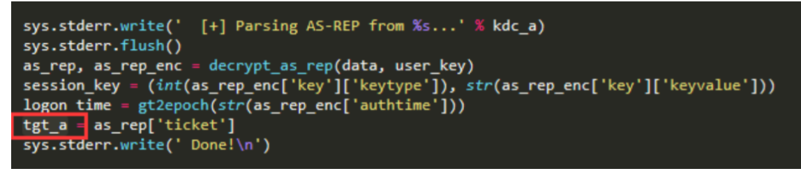 在AS发起请求之后,KDC(AS)将返回一张不包含有PAC的TGT票据给Client。在这里是tgt_a。