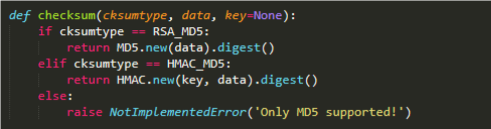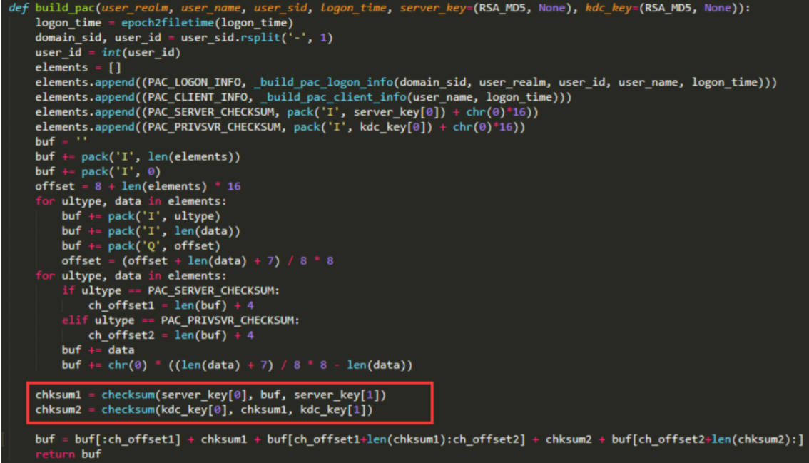 这里我们重点关注一下 PAC 中的 chksum1 和 chksum2,也就是“PAC 的引入”中提到的 PAC 的两个数字签名 PAC_SERVER_CHECKSUM 和 PAC_PRIVSVR_CHECKSUM。 注意一下其中第一个参数 server_key[0]和 kdc_key[0]的值其实是程序指定的 RSA_MD5, 而 Key 的值为 None,但原则上来说这个加密方式是应该由 KDC 来确定的。也就是说加密 PAC_SERVER_CHECKSUM 和 PAC_PRIVSVR_CHECKSUM 这两个数字签名的 Key 应该分别是