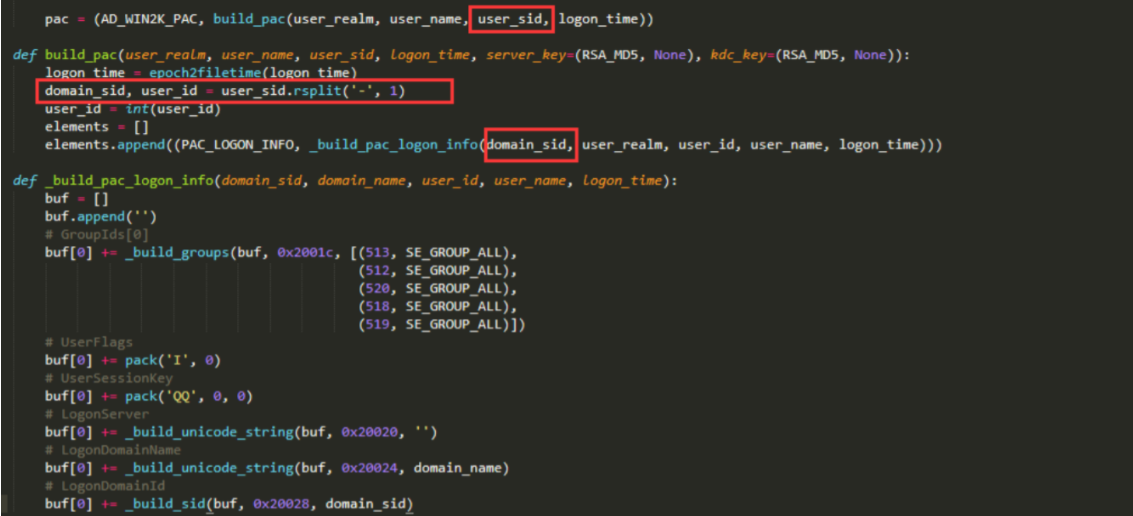 同时在这个过程中我们也需要关注一下 user_sid 这个参数,build_pac 函数会将其分割, 然后重新构造高权限的 sid 的值。在这里 user_sid 的值为 S-1-5-21-4249968736-1423802980- 663233003-1104,分割之后 domain_sid 为 S-1-5-21-4249968736-1423802980-663233003, user_id 为 1104。