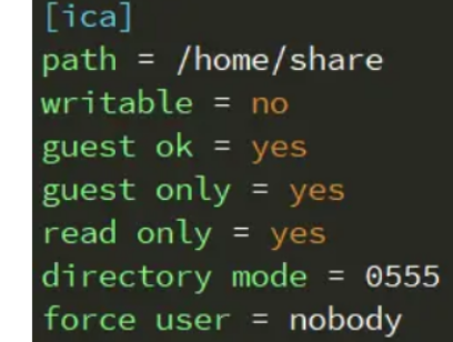 首先在VPS上搭建Samba服务,然后添加一个无需认证即可访问的共享目录,配置信息如下图所示: