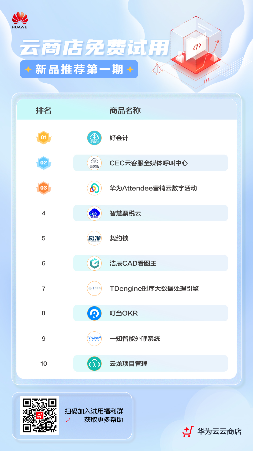 基于海量上架商品,云商店从产品上架时间、服务能力维度、销售维度出发,利用算法综合计算排列,推出“云商店免费试用新品推荐榜”,每月更新,力求为更多企业提供上云参考坐标!