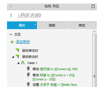 热区用来圈定指示线的移动范围,让指示线只有在图表内移动,所以热区大小位置只需要覆盖图表内即可,同时需要用到热区的“鼠标移动时”事件(在“更多事件>>>”里面)。