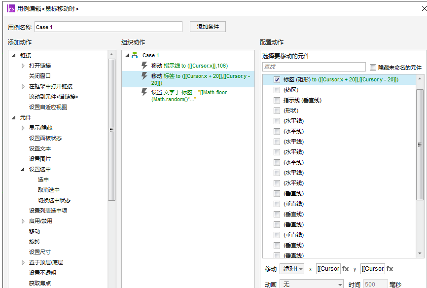 跟随光标移动,原理就是在光标移动时重新设置元件的位置参数(X轴、Y轴),参考数值就是光标当前的位置参数。需要用到元件的“鼠标移动时”交互事件作为触发条件,光标当前的(x, y)坐标作为元件新的位置参数。