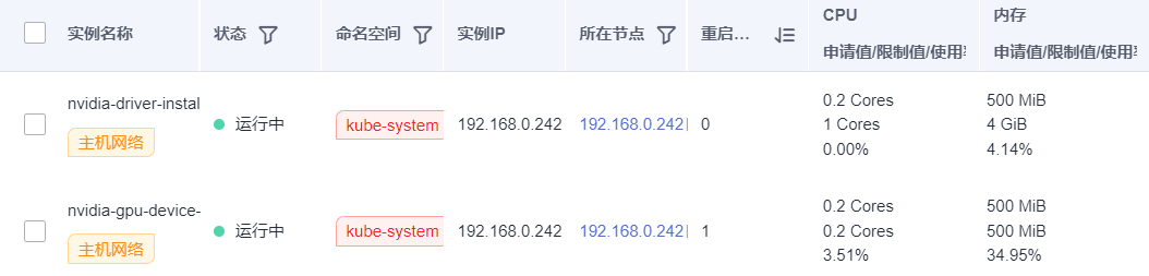 注意: 该gpu插件仅安装nvidia驱动,并未安装cuda组件,在宿主机若要开发gpu应用仍需自行安装cuda; 容器场景则不涉及。