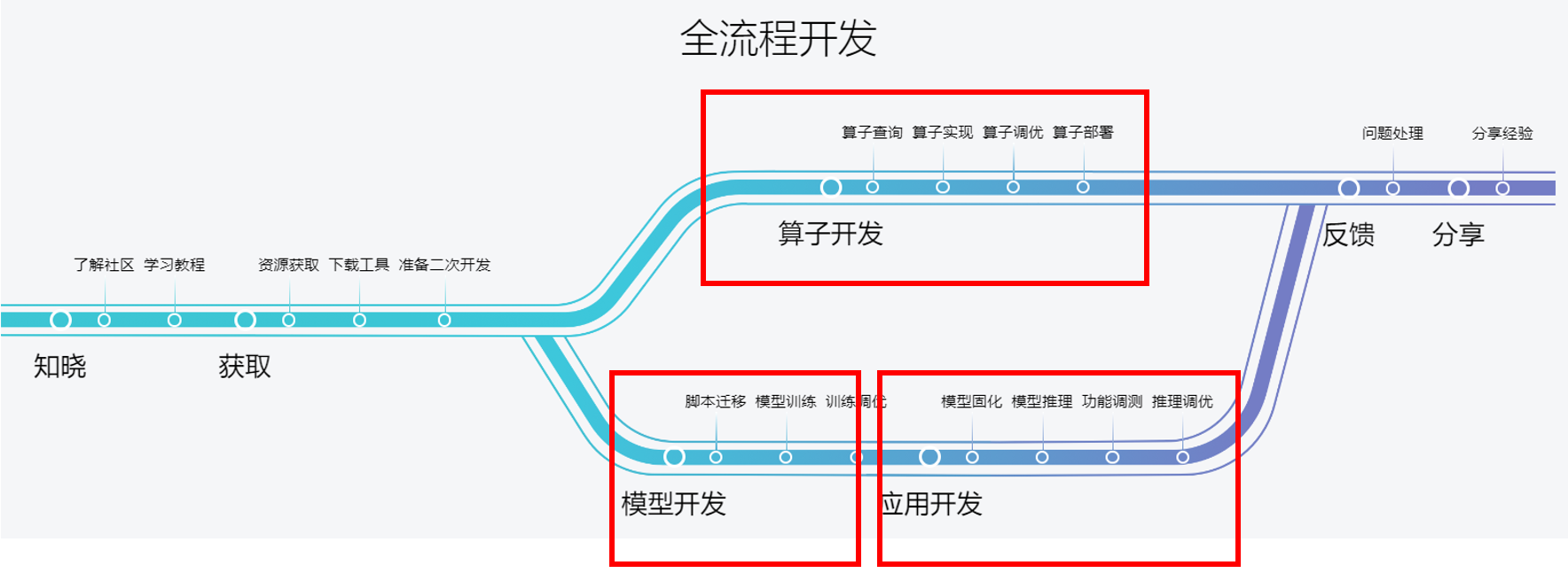 建议新来的开发者,先去看看“昇腾开发Guidebook”,https://www.hiascend.com/developer/guidebook/start,对昇腾、昇腾社区有个整体的感受。从下面这张图,我们知道昇腾可以做应用开发、算子开发、模型开发,再具体看每种开发的主要内容有哪些,流程是怎样的,用到哪些技术和工具?以及昇腾社区提供的全流程开发保障与服务。
