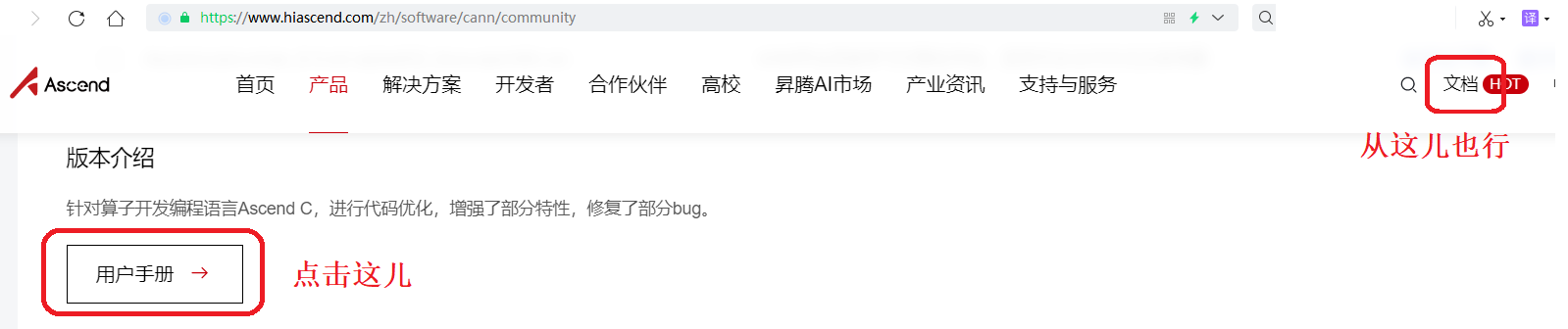 昇腾社区首页,“产品”下选择“CANN”,然后选择“社区版”,往下拉,点击“用户手册”。