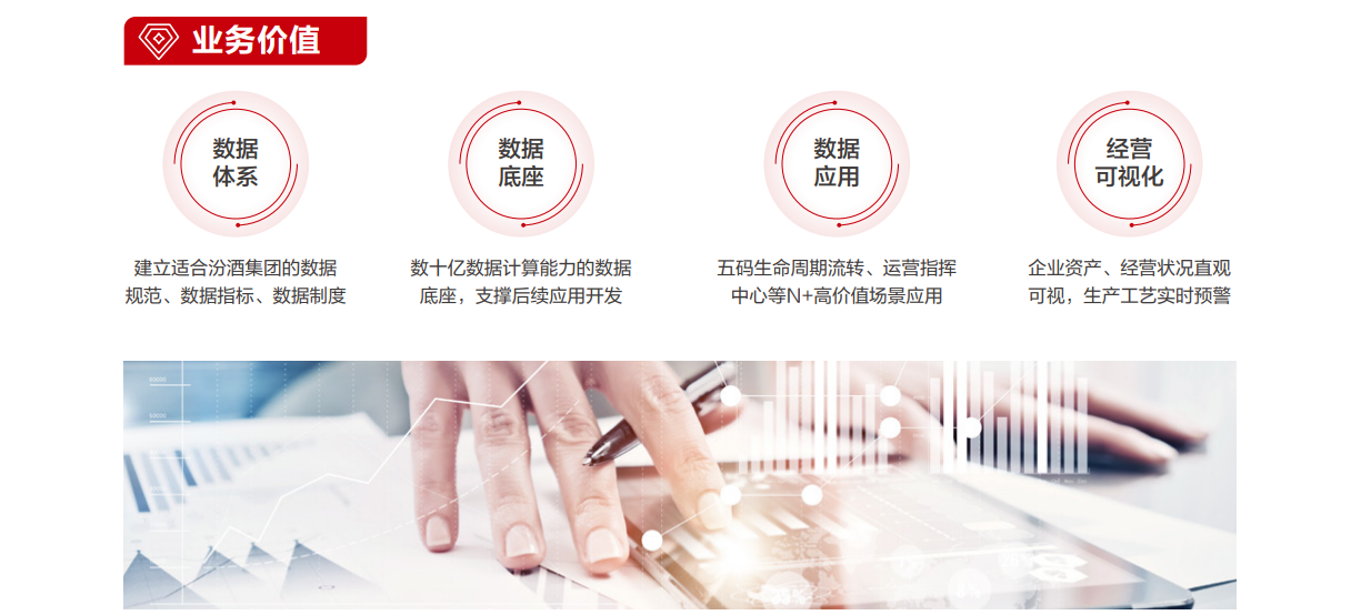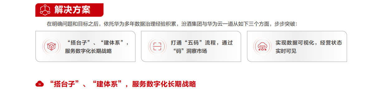 在转型过程中,汾酒集团深刻地体会到,数字化转型是一项复杂而又长期的工作,底层基础、中间的平台建设和前端应用缺一不可,为此,汾酒集团先“搭台子”、“建体系”,携手华为云,结合华为数据实践的方法论及丰富的工具,率先完成数据底座与数据管理体系的建设,完成了数据基础设施搭建的任务,为后续数字化转型与创新试点铺平了道路。