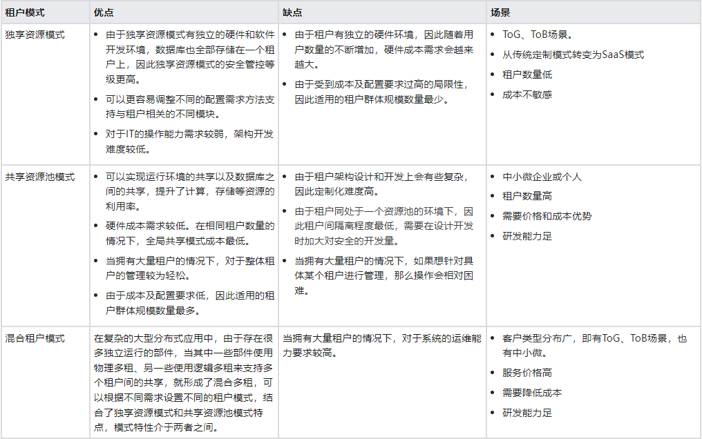 3、混合租户模式:综合独享资源模式和共享资源池租户模式特点。