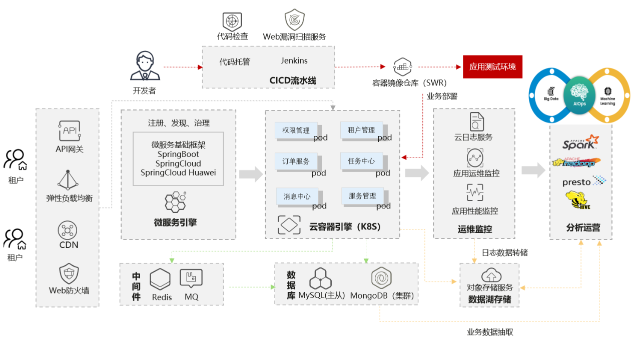 基于长期的技术支持实践经验,华为云结合在产品和技术方面的沉淀,总结了云上典型的SaaS云原生应用架构,架构主要分为: