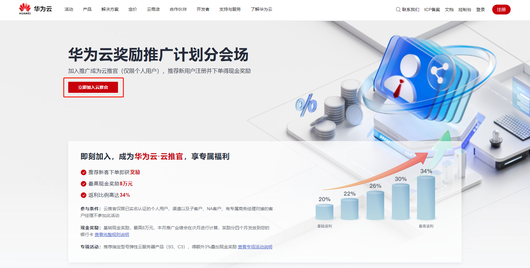 华为云奖励推广计划分为多个会场,每个会场都有不同的奖励政策和推广对象。如果您是个人用户,可以加入华为云推广计划成为云推官,通过分享您的专属推广链接邀请新用户注册并下单,即可获得现金奖励。