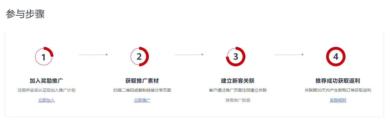 华为云是华为公司推出的云计算服务平台,提供了包括计算、存储、网络、安全等多种云计算产品和服务。为了扩大华为云的用户群体,华为云推出了奖励推广计划,允许个人用户加入推广计划成为云推官,通过分享自己的推广链接邀请新用户注册并下单,即可获得现金奖励。简单来讲就是下面图中的4个步骤: