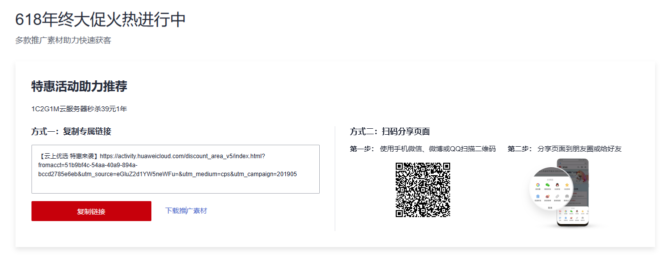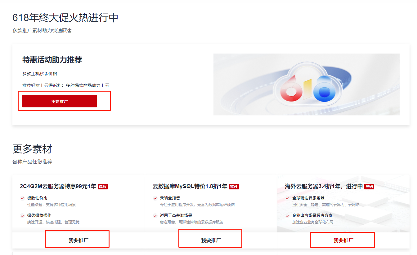 登录华为云账号后,点击首页上方的“推广计划”按钮,进入推广计划页面。在页面中,您可以看到不同的会场,每个会场都有不同的奖励政策和推广对象。选择一个适合自己的会场,点击“加入会场”按钮即可加入推广计划。比如说现在邻近6.18那么活动力度会非常大。或者我们可以选择我们自己想要的一些产品就,点击我要推广获取相关链接,具体操作如下图所示: