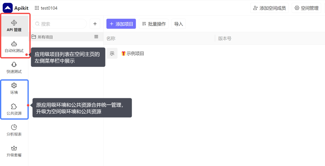 升级后登录系统默认进入空间主页,空间主页中左侧菜单栏有 API 管理和自动化测试等应用的项目列表页入口,方便快速切换应用项目。