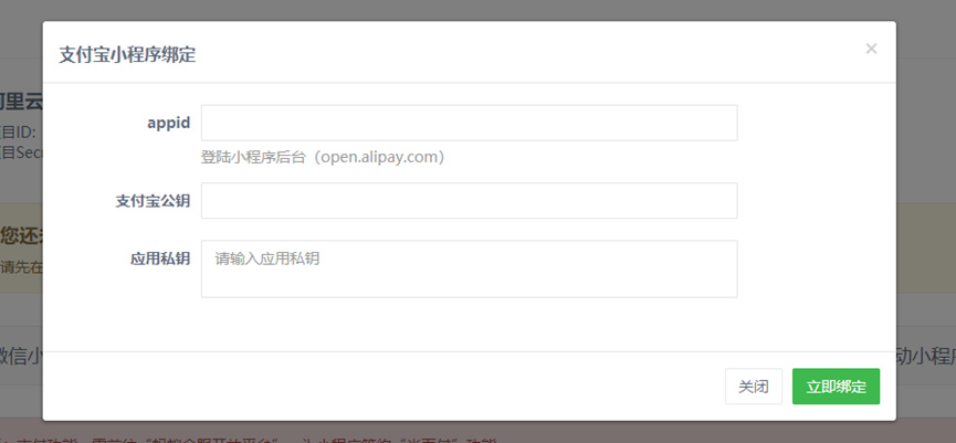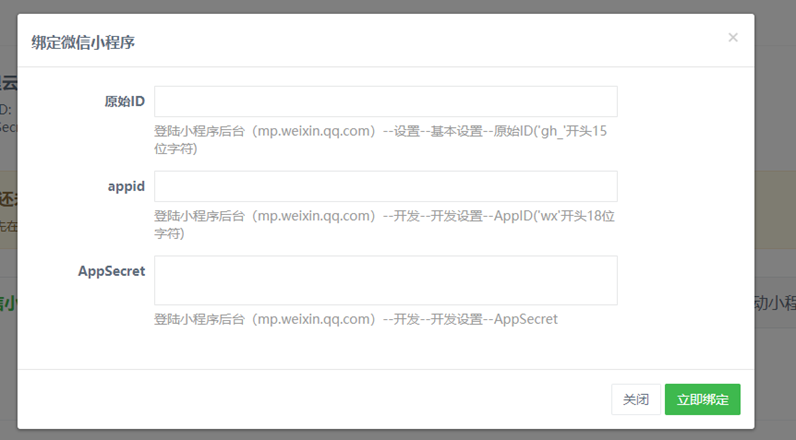 将以上三项全部填入小程序页面,点击立即绑定,即可绑定小程序。