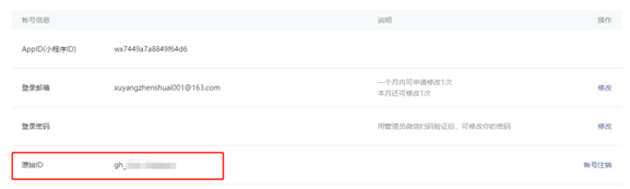微信小程序原始ID:进入微信公众平台,点击设置,下拉页面,找到账号信息,即可看到小程序的原始ID。