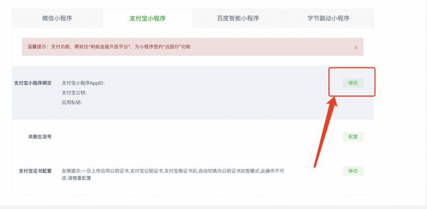 支付宝端和微信端一样,都需要先注册小程序,如果没有注册小程序的话,需要在支付宝平台注册小程序,注册小程序的步骤参考小程序注册手册;已经注册过小程序的,可以直接绑定小程序之后进行配置。
