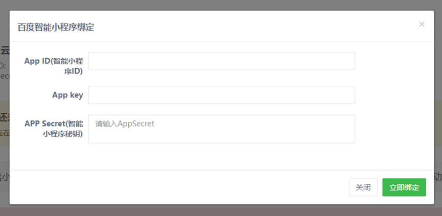 电脑端进入百度小程序开放平台,找到百度小程序的appid 、App Key、App Secret,以此复制到小程序后台,填入相对应的空白处,点击立即绑定即可。