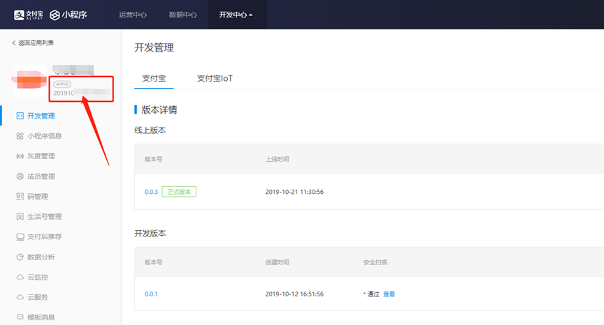 Appid: 登录支付宝开放平台,选择开发中心,小程序应用,进入小程序,点击查看小程序,下图箭头中就是支付宝小程序的appid。
