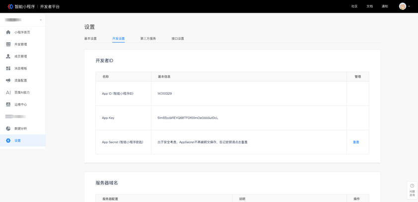 进入百度小程序开放平台,“平台首页-设置”,获取 AppID(智能小程序 ID)、App Key、App Secret(智能小程序密钥)。
