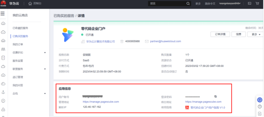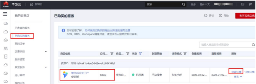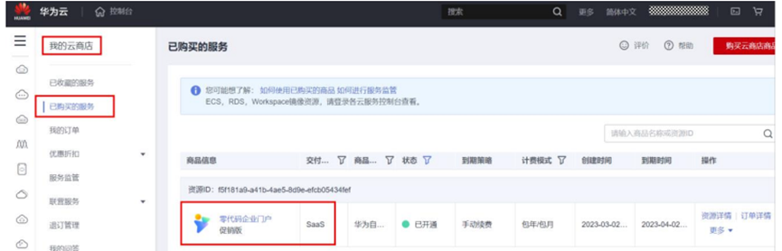 查看已购服务:购买后,进入“买家中心-我的云商店-已购买的服务”,找到已开通的 “零代码企业门户”产品。