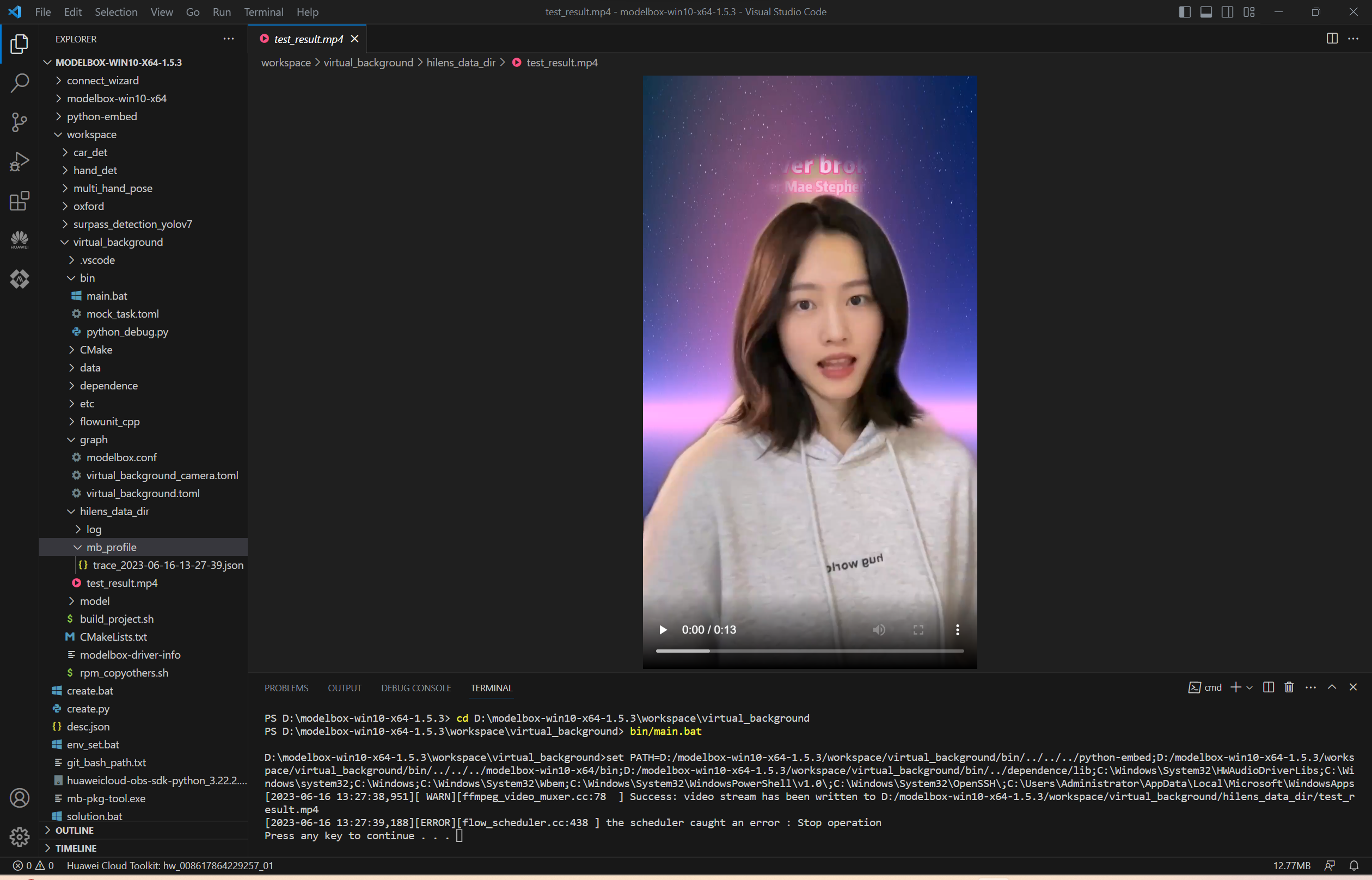 切换到工程目录,执行bin/main.bat运行应用,生成的视频和性能统计文件都在hilens_data_dir文件夹下面: