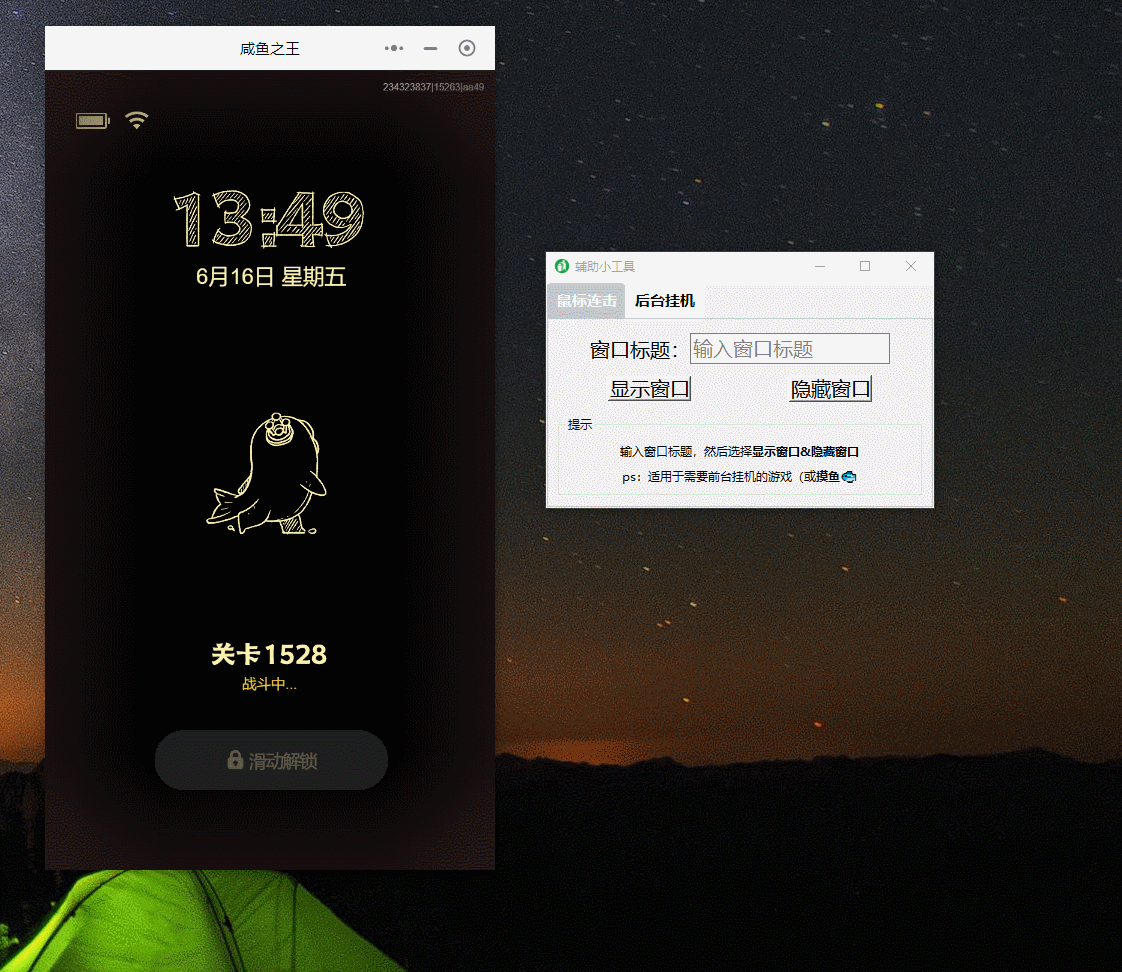 咸鱼之王后台挂机软件和 鼠标连点器 Python实现:https://www.bilibili.com/video/BV1Gh4y1371u/