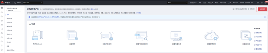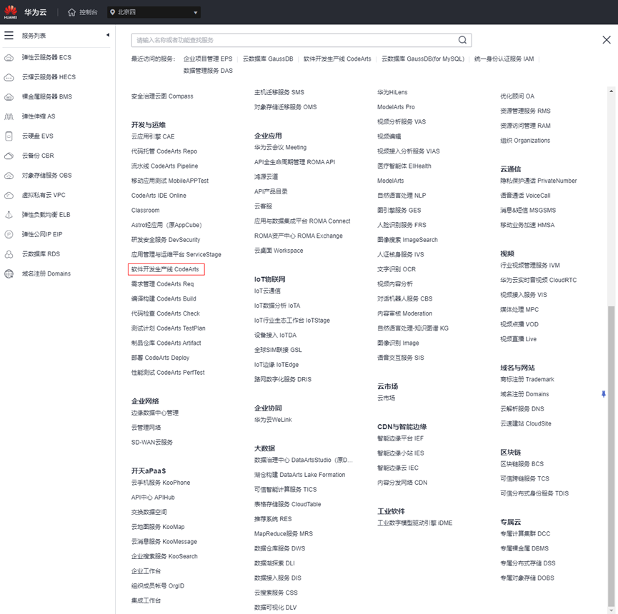- 进入控制台,选择区域,例如“华北-北京四”,在“开发与运维”中选址“软件开发生产线 CodeArts”.