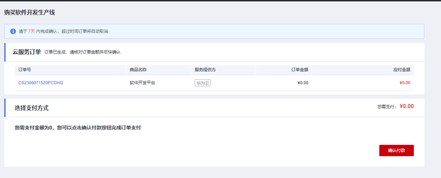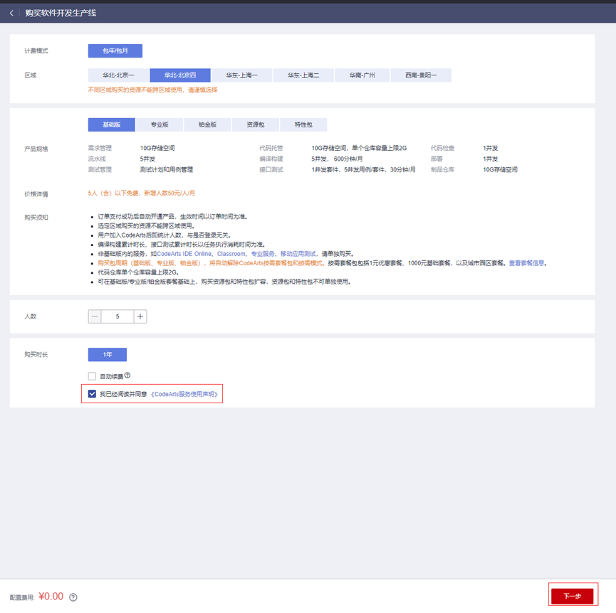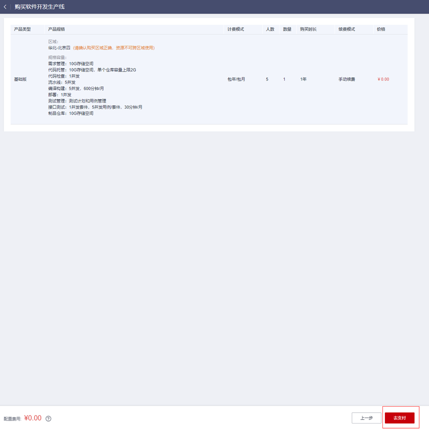 - 按如下配置购买免费使用的基础版软件开发平台。