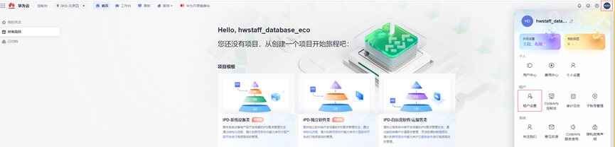 - 鼠标移动至右上角个人帐号,单击“租户设置”。