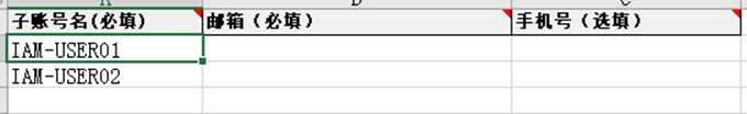 - 在模板中填写子账号名和帐户邮箱。模板单次最大支持100个成员的批量导入。