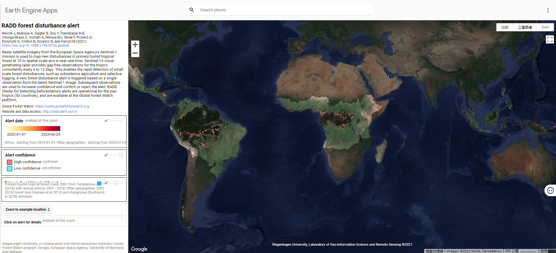 RADD(RAdar for Detecting Deforestation)警报有助于世界资源研究所的全球森林观察倡议,提供及时和准确的信息,以支持可持续森林管理和打击非法砍伐森林的执法活动中的广泛利益相关者。RADD警报是在谷歌地球引擎中实现的。这个数据集也可以在全球森林观察--开放数据门户、Sepal.io和EarthMap上找到。, and
