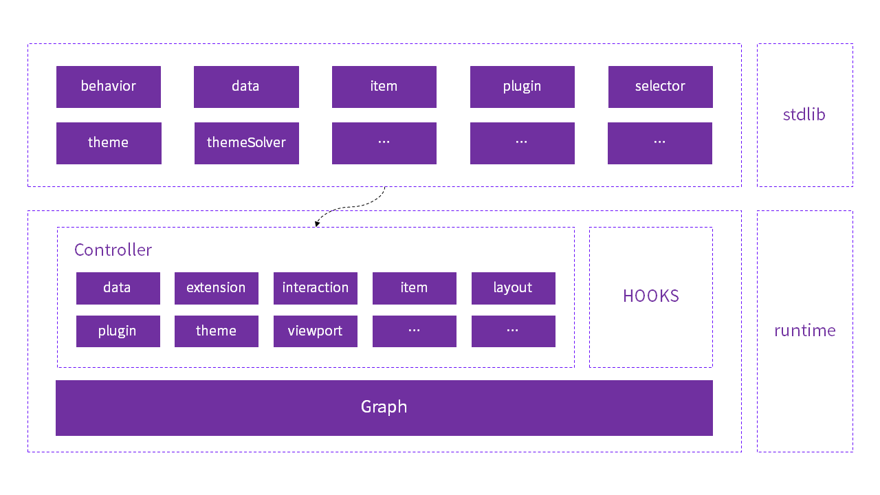 新版G6整体是基于“插件化”的架构进行设计的,对外整体暴露Graph类及StdLib标准库,将主题、数据处理、布局、视图、类型、交互等均作为插件来进行处理,提供更高层次的定制化需求,提升更好的开源能力。