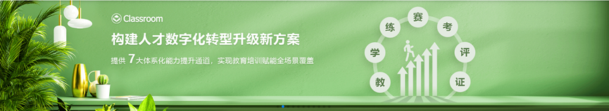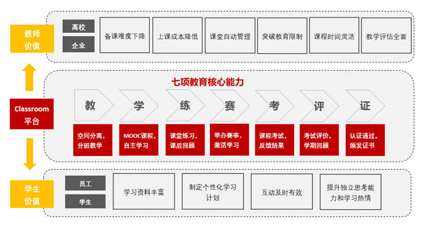 基于classroom平台教、学、练、赛、考、评、证这七大核心能力,结合产品能力与企业、高校、合作伙伴一起,打造基于classroom为核心的开发者生态教育数字平台,输出教育平台解决方案,助力高校人才培养模式创新。